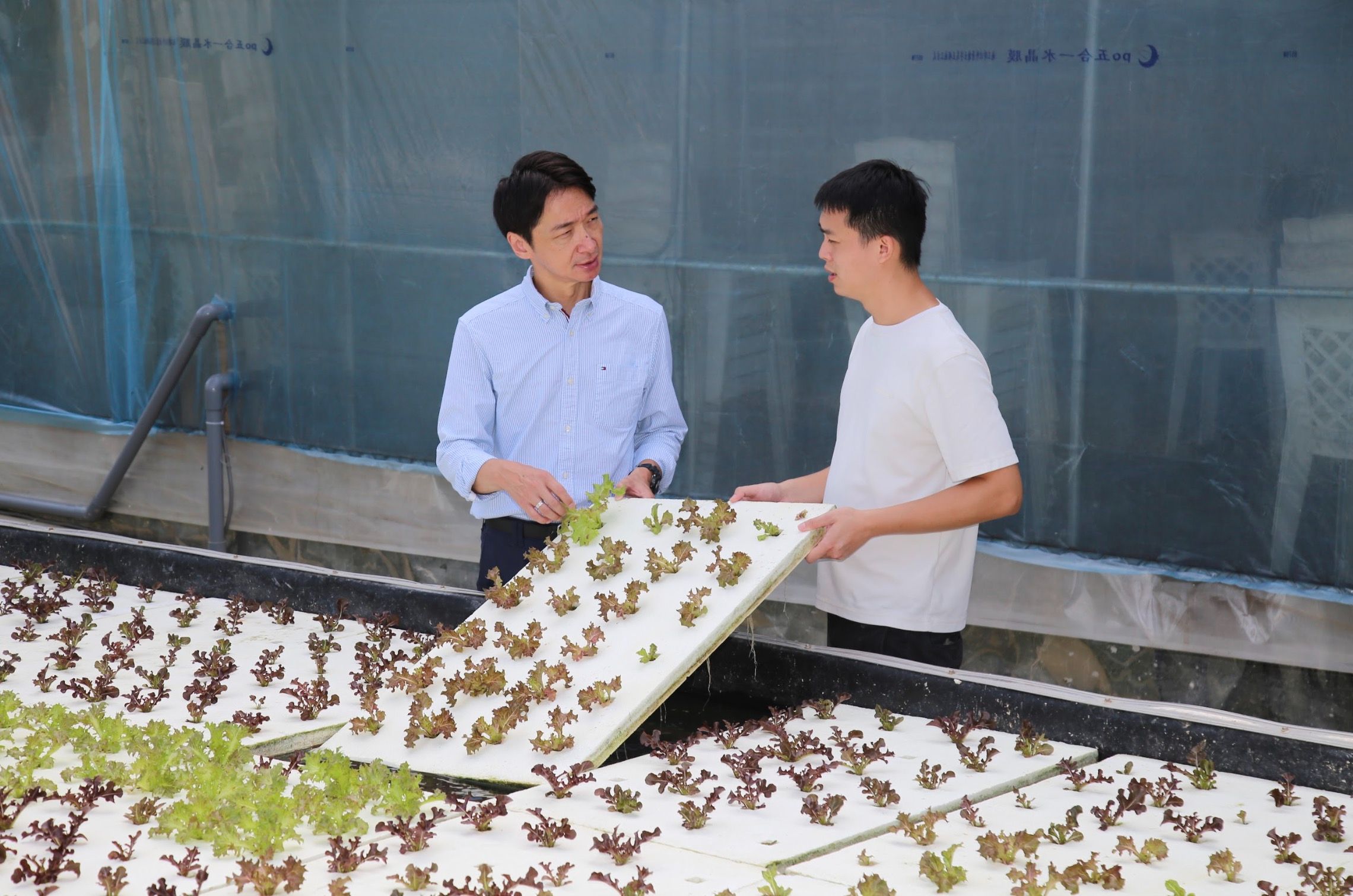 陳學立總幹事 ( 左 ) 至愛家水耕農場溫室關心青農彭敬傑經營情形。