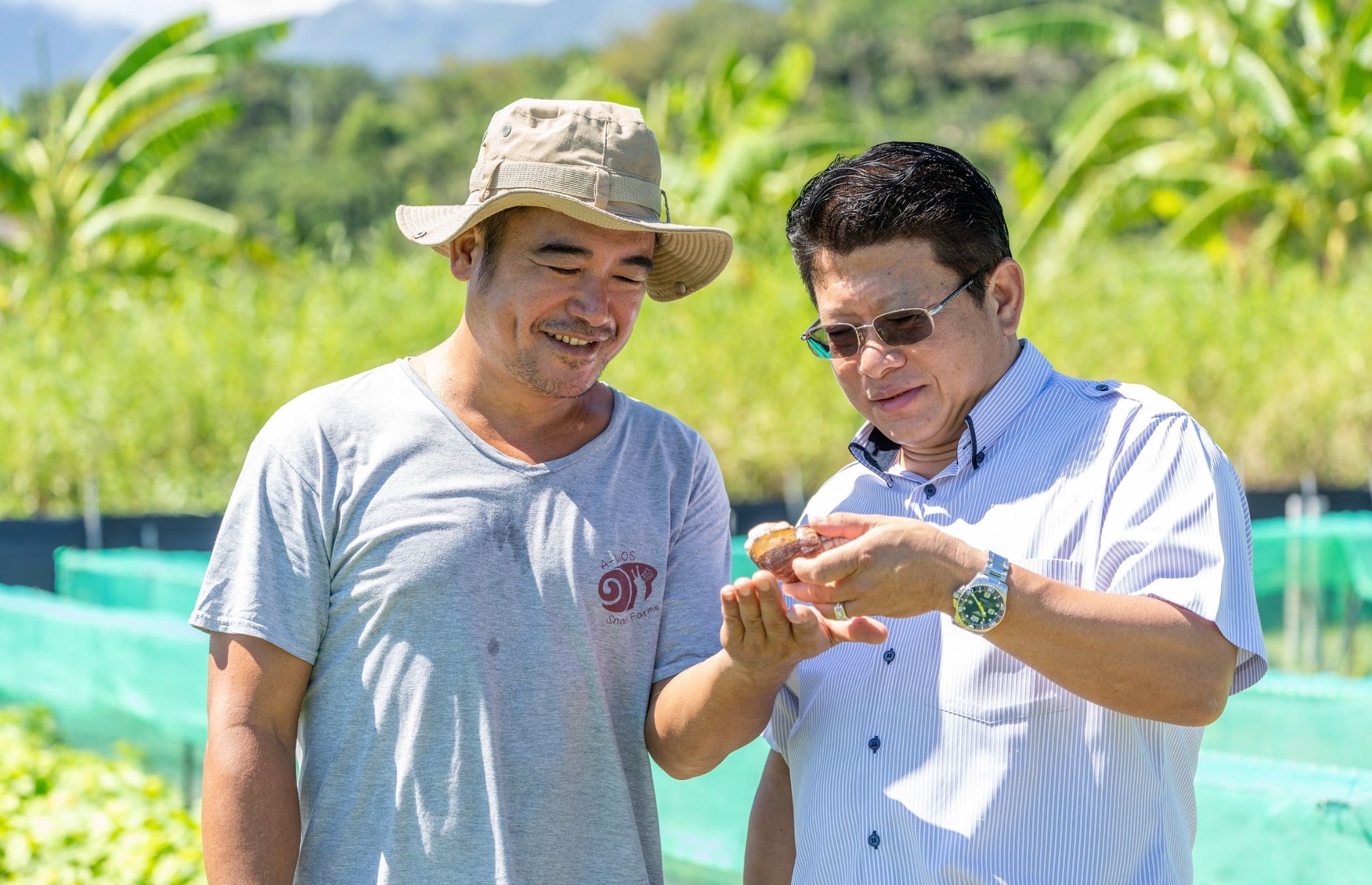洪總幹事(右)走進蝸牛園關心文宏程的養殖狀況,用心為農民與長濱這片土地持續耕耘。