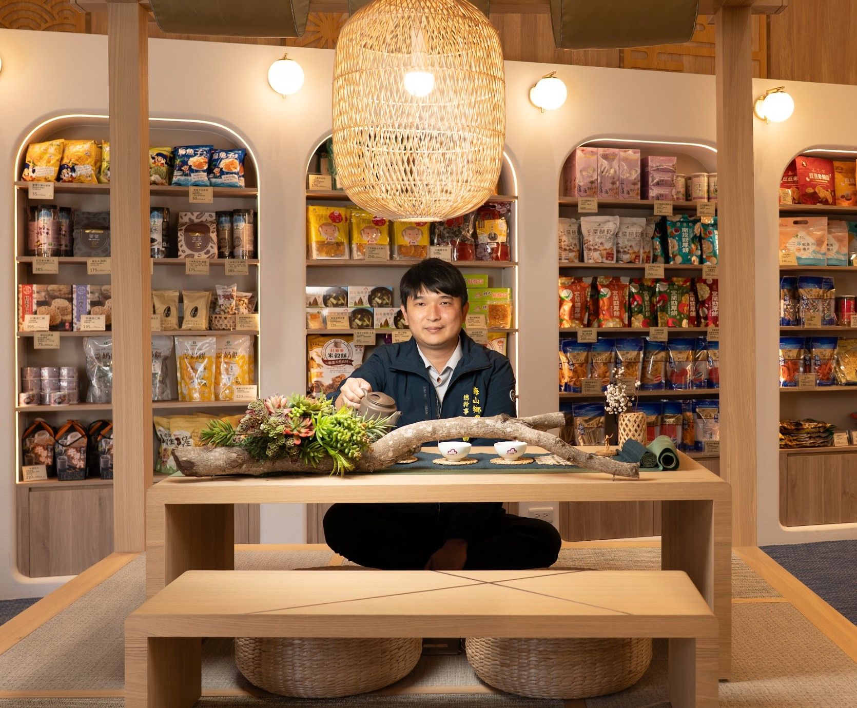 延伸到物理空間,2025年初落成的購物中心,也是總幹事的得意之作。給予設計師極大發揮空間,甚至引進了希臘雅典機場在使用的的國寶級地毯,天花板的鍍鈦鋼條還專門開模製作,全新的「梅山賞悅」消費空間在暖黃的燈光下閃耀著低調的光澤。就連信用部門的動線也重新規劃,讓顧客感受更好的體驗與服務。梅山鄉農會成為一個美的容器,裝載來自山林的饋贈。